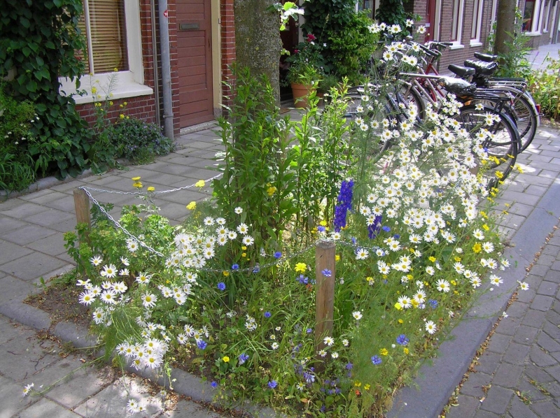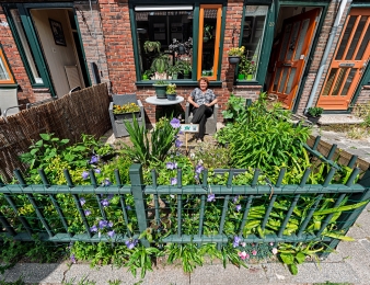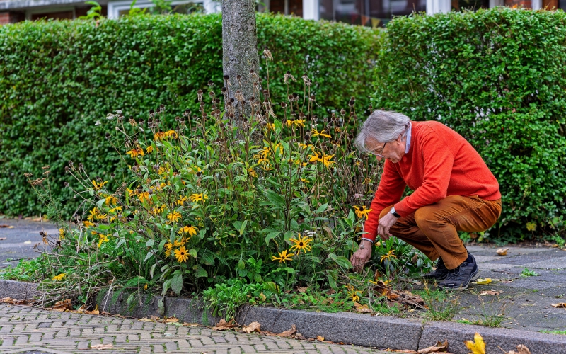 “Daarna organiseer je een dag waarop je gaat planten”, vervolgt hij. “Laurens Stiekema van de gemeente Groningen bracht tuinaarde. De buurtvereniging betaalde de koffie met koek. Meerdere straten in De Hoogte en de Professorenbuurt deden mee. Als je nu in mei langs de straten loopt, dan zie je bloemen, kleur, plezier!”