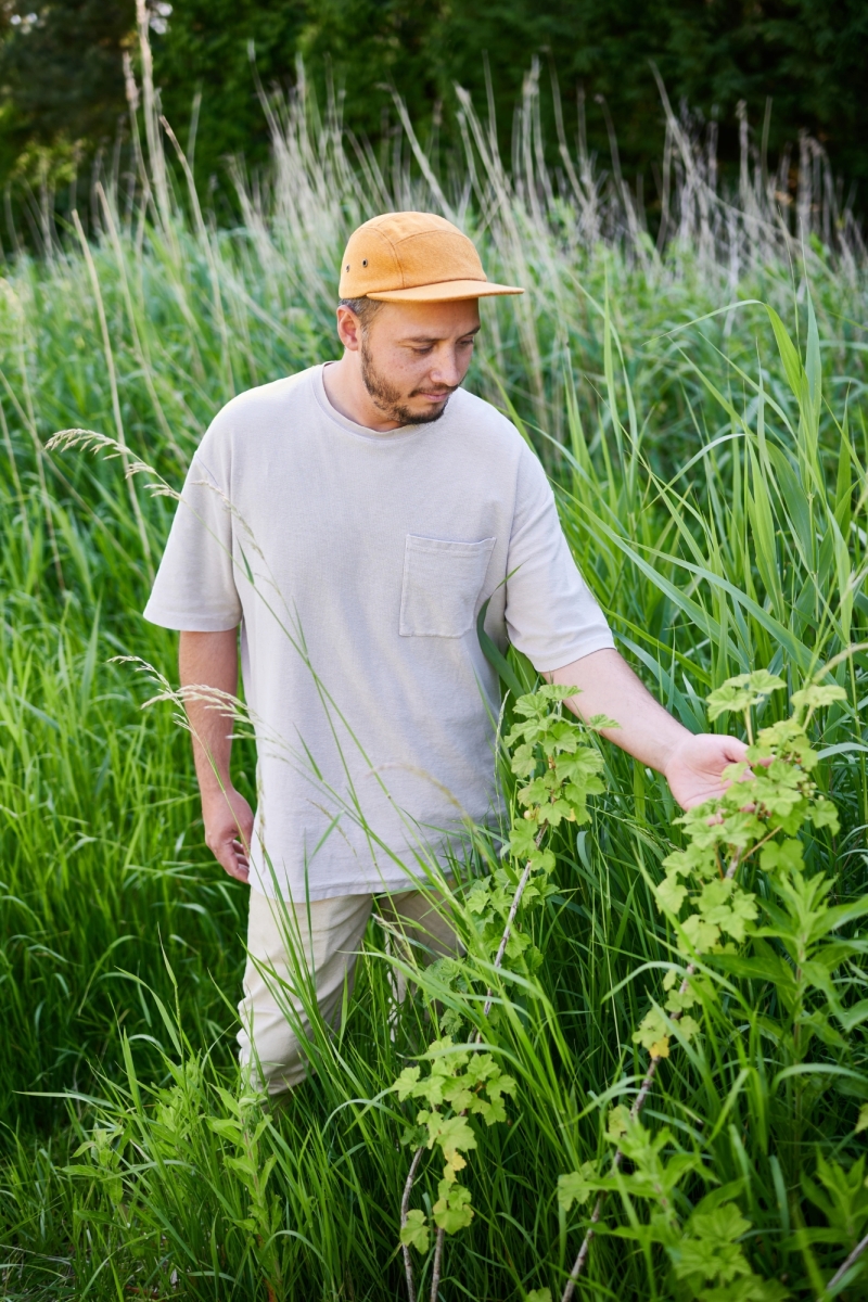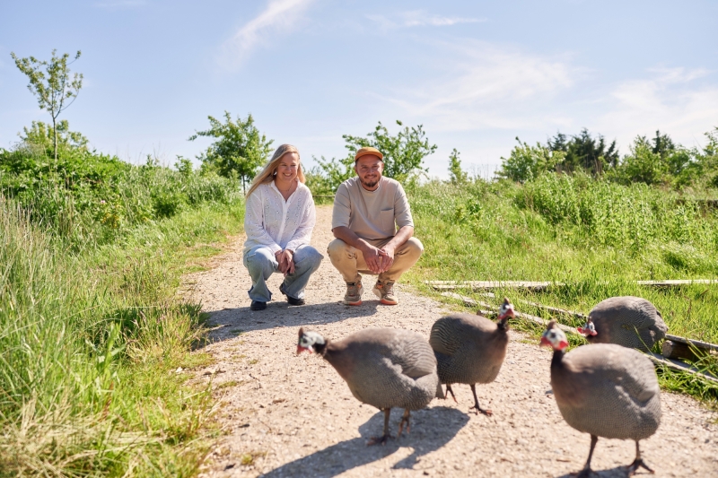 “We werken hier zonder bestrijdingsmiddelen; de parelhoenders dragen bij aan de plaagbestrijding en eten de teken op”, vervolgt hij. “Zo hou je een natuurlijk evenwicht. Ook laten we de natuur zoveel mogelijk haar werk doen: soms krijgen jonge plantjes een extra emmertje water, maar verder moet alles het hier doen met regenwater. De varkens voeren we met bierbostel van Bax bier, voor hen een afvalproduct, maar ondertussen perfect varkensvoer. Van bomen die hier in de buurt zijn omgewaaid, maken we vlonders of houtsnippers voor op de paden. En de bijen zorgen voor de verspreiding van stuifmeel.”