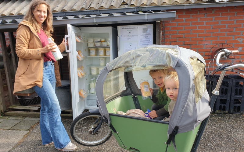 Karlien Meijer van de NMF Groningen met haar kinderen bij boerderijwinkel Harener. Dit najaar zijn de receptenroutes gelanceerd. Fietsroutes waarbij je je voedsel van dichtbij haalt en naar huis gaat met de ingrediënten voor een lokaal gerecht. Lekker, eenvoudig te bereiden. Goed voor jou, de makers en beter voor het milieu.