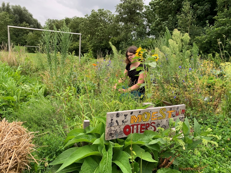 Terwijl de kinderen van basisschool De Swoaistee lekker van hun vakantie genieten, is moestuincoach Sigrid Kingma druk in de weer in de buurtmoestuin van Leuwenborg. Ze past op de bonen die ze samen met de leerlingen plantte voor het ‘Red de Groninger boon’-project.