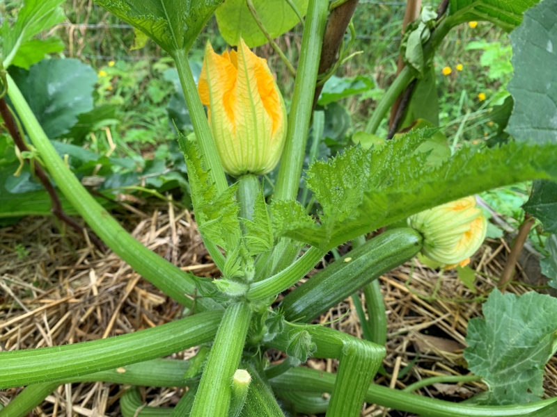 Ze wijst naar een courgetteplant onder de Oldambtster witte. ‘Die doet het super goed. Je kunt er elke dag een nieuwe vrucht van plukken.’