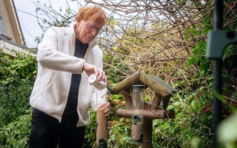 Maar ook in zijn eigen tuin is het een komen en gaan van vogels. Een groep mussen zit vrolijk te kwetteren in de struik. Een voor een vliegen ze naar de zadenmix die op tafel ligt. “Als wij de mussen niet bijvoeren hadden we er misschien maar vijf in de tuin gehad. Nu zijn het er zeker twintig”, vertelt hij. “Huismussen zijn voor het grootste gedeelte van het jaar afhankelijk van mensen. Het is daarom heel nuttig om voer op te hangen voor deze vogels.”