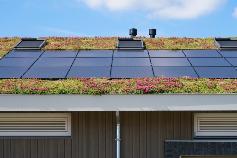 Een groen dak met zonnepanelen zorgt voor een langere levensduur en meer rendement van de panelen.